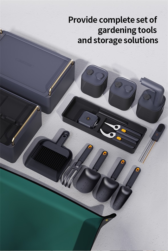 • Layer B: Pruning shears, straight shears, 1L garden electric sprayer handle, 1L sprayer body, 100m gardening ties, 75x75cm replacement mat, 3 pairs of gloves, and a gardening cleaning set